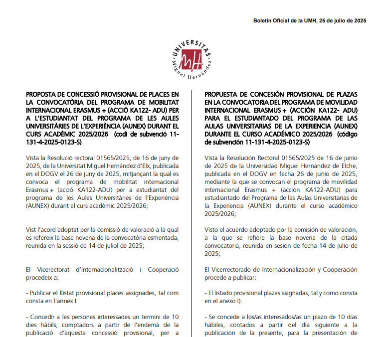 Ya se encuentra disponible el listado provisional de plazas asignadas del Programa de Movilidad Internacional Erasmus+ (Acción KA122‑ADU) para el curso 2025/2026, publicado en el Boletín Oficial de la UMH con fecha 25 de julio de 2025