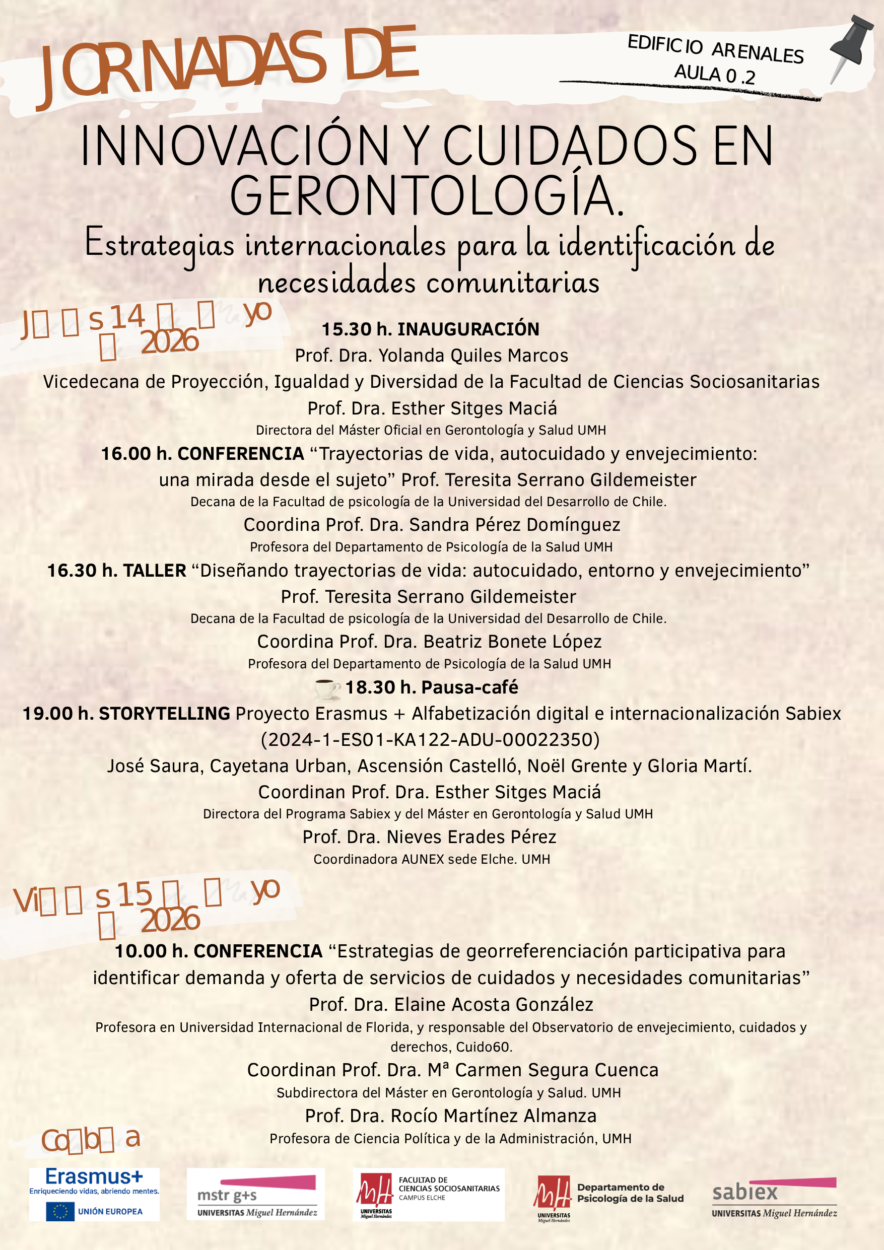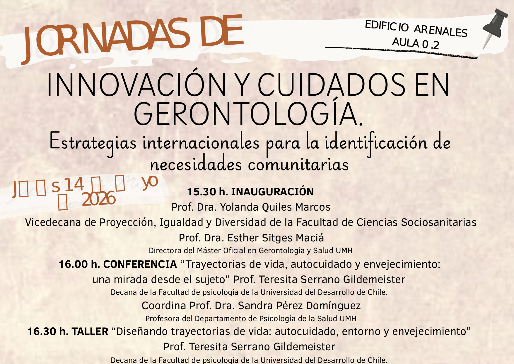 La UMH celebrará los días 14 y 15 de mayo de 2026 las Jornadas de Innovación y Cuidados en Gerontología, centradas en las estrategias internacionales para identificar necesidades comunitarias. El encuentro, que tendrá lugar en el Edificio Arenales, reunirá a especialistas en envejecimiento, autocuidado y cuidados comunitarios, e incluirá conferencias, un taller y una actividad vinculada al proyecto Erasmus+ Sabiex.